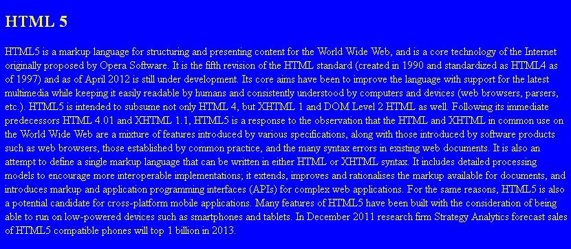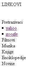 Vežba 01. ( <H1> ... </H1> , <SUP>... </SUP> , <BR>) ![]() Vežba 02. ( <H1> ... </H1> , <LI> , <BR>) Uneti tekst i formatirati ga kao na slici ![]() Vežba 03. ( <H2> ... </H2> , <SUP>... </SUP> , <font color="red"> ... </font> , blue , <BR>) Uneti tekst i formatirati ga kao na slici ![]() Vežba 04. ( <H2> ... </H2> , <BR>, <img src="HST.jpeg" width="300" height="225" /> ) Uneti tekst i sliku i formatirati ih kao na slici ![]() Vežba 05. ( <H2> ... </H2> , <A href="http://www.google.com">www.google.com </A> <BR>) Uneti tekst i formatirati ga kao na slici ![]() Vežba 06. ( <H2> ... </H2> , <body bgcolor="blue"> , <font color="yellow"> ... <-font>) Uneti tekst i formatirati ga kao na slici